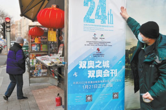昨天上午,位于廣渠門內(nèi)大街富貴園購物中心前的郵政報刊亭旁,三位來自北京郵政的工作人員正忙碌著。很快,三張印有“雙奧之城,雙奧會刊”“北京2022年冬奧會和冬殘奧會官方中文會刊1月21日正式出版”等字樣的嶄新海報貼上了報刊亭的公益宣傳欄。以白色和藍(lán)色為主色調(diào)的主題海報剛剛貼好,就立刻吸引了過往路人的駐足觀看:“這海報真有冬奧氛圍?!薄岸瑠W會刊?到時候得來一份看看。”不少路人掏出手機,對著海報上的預(yù)訂二維碼現(xiàn)場掃碼,了解具體情況。
