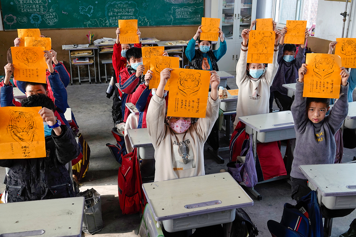 1月7日,新絳縣光村小學(xué),學(xué)生們展示生肖虎年畫。高新生 攝