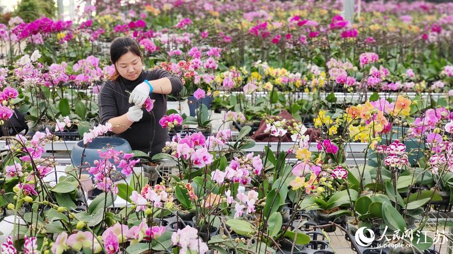 基地員工忙著對(duì)蝴蝶蘭進(jìn)行組盆。丁華明攝人民網(wǎng)宿遷1月13日電 (黃啟源)臨近春節(jié),江蘇沭陽(yáng)縣耿圩鎮(zhèn)的蝴蝶蘭基地里百花爭(zhēng)妍,恰似彩蝶起舞。作為當(dāng)?shù)靥m花產(chǎn)業(yè)化示范園區(qū),這里培植有60余個(gè)蘭花品種,目前年實(shí)現(xiàn)產(chǎn)值過(guò)億元。基地年累計(jì)用工600余人,其中相當(dāng)一部分是當(dāng)?shù)氐褪杖霊?,可為每人每年增加工資性收入4萬(wàn)余元。