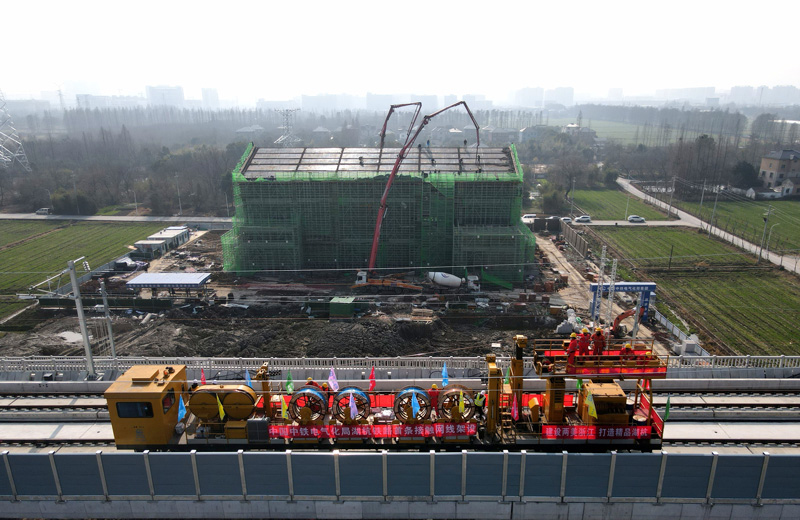 湖杭鐵路全線最大變電所封頂 首條接觸線架設(shè)