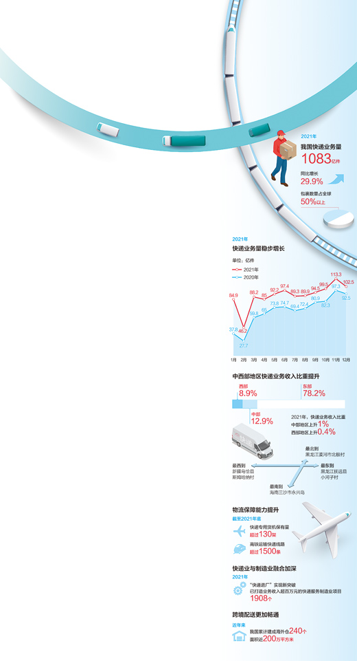 快遞業(yè)既貫通生產(chǎn)、分配、流通、消費各環(huán)節(jié),又關聯(lián)一二三各產(chǎn)業(yè)。2021年,我國快遞業(yè)務量達1083億件,同比增長29.9%??爝f業(yè)蓬勃發(fā)展,不僅有利于制造業(yè)通過兩業(yè)融合實現(xiàn)降本增效,更在走出去的步伐中助力“國貨出海”,支撐跨境商品流動更便利,為行業(yè)內(nèi)外帶來更多機遇。