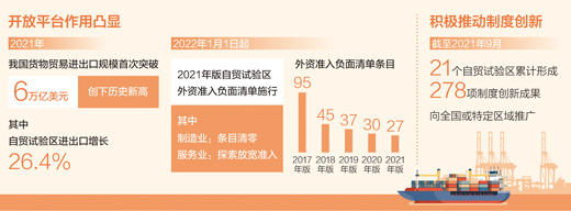 日前,我國2021年外貿(mào)成績單發(fā)布,貨物貿(mào)易進出口規(guī)模首次突破6萬億美元。其中,自由貿(mào)易試驗區(qū)進出口增長26.4%,呈現(xiàn)蓬勃發(fā)展態(tài)勢。
