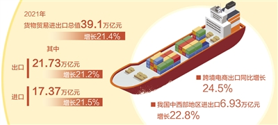 “跨境電商、市場采購等新業(yè)態(tài)新模式是我國外貿(mào)發(fā)展的有生力量,也是國際貿(mào)易發(fā)展的重要趨勢。新冠肺炎疫情發(fā)生以來,我國跨境電商發(fā)揮在線營銷、在線交易、無接觸交付等特點(diǎn)優(yōu)勢,積極培育參與國際合作和競爭的新優(yōu)勢,進(jìn)出口規(guī)模持續(xù)快速增長?!崩羁谋硎荆?021年我國跨境電商進(jìn)出口規(guī)模達(dá)到1.98萬億元,增長15%;市場采購出口增長32.1%。