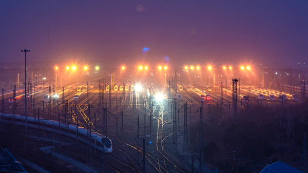 凌晨,一列動(dòng)車組列車駛出上海虹橋動(dòng)車運(yùn)用所。上海鐵路部門供圖