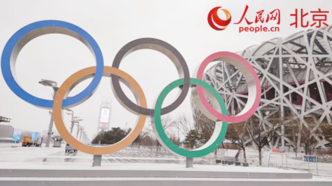 位于“鳥巢”西側(cè)的“奧運五環(huán)”形象景觀。 人民網(wǎng) 李博攝