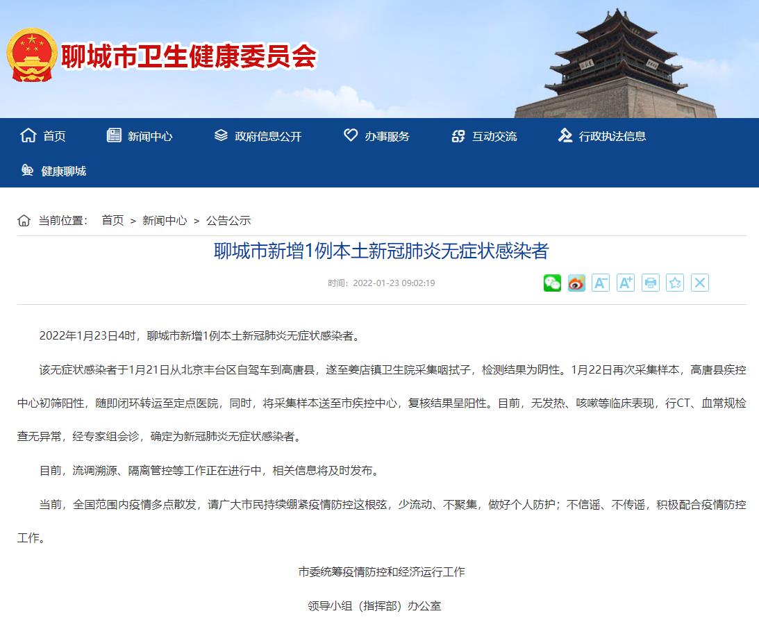 人民網(wǎng)聊城1月23日電 (劉穎婕)據(jù)聊城市衛(wèi)健委通報,2022年1月23日4時,聊城市新增1例本土新冠肺炎無癥狀感染者。