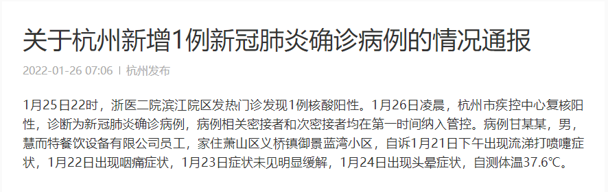 1月25日22時(shí),浙醫(yī)二院濱江院區(qū)發(fā)熱門診發(fā)現(xiàn)1例核酸陽性。1月26日凌晨,杭州市疾控中心復(fù)核陽性,診斷為新冠肺炎確診病例,病例相關(guān)密接者和次密接者均在第一時(shí)間納入管控。病例甘某某,男,慧而特餐飲設(shè)備有限公司員工,家住蕭山區(qū)義橋鎮(zhèn)御景藍(lán)灣小區(qū),自訴1月21日下午出現(xiàn)流涕打噴嚏癥狀,1月22日出現(xiàn)咽痛癥狀,1月23日癥狀未見明顯緩解,1月24日出現(xiàn)頭暈癥狀,自測(cè)體溫37.6℃。
