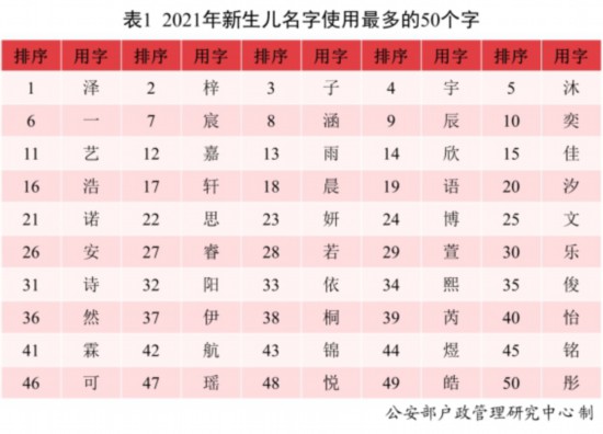 報(bào)告顯示,2021年出生并已經(jīng)進(jìn)行戶(hù)籍登記的新生兒名字中,使用頻率最高的50個(gè)字依次為澤、梓、子、宇、沐等。