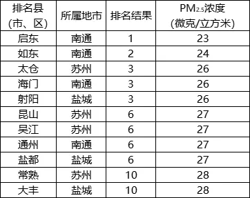 PM2.5濃度相對較好的前10位(1-10名)依次是:啟東、如東、太倉(海門、射陽并列)、昆山(吳江、通州、鹽都并列)、常熟(大豐并列)。