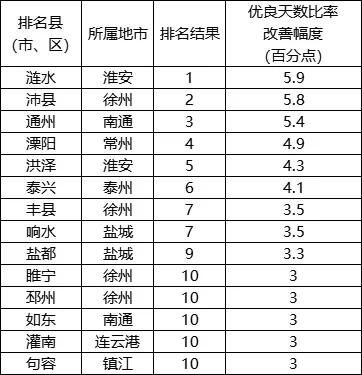 PM2.5濃度改善幅度相對較好的前10位(1-10名)依次是:沛縣、洪澤(江都并列)、射陽、漣水、灌南、儀征、睢寧(沭陽并列)、通州(鹽都并列)。