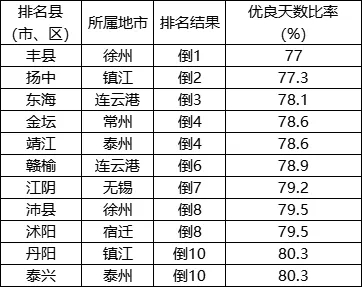 優(yōu)良天數(shù)比率相對較差的后10位(倒1-10名)依次是:豐縣、揚(yáng)中、東海、金壇(靖江并列)、贛榆、江陰、沛縣(沭陽并列)、丹陽(泰興并列)。