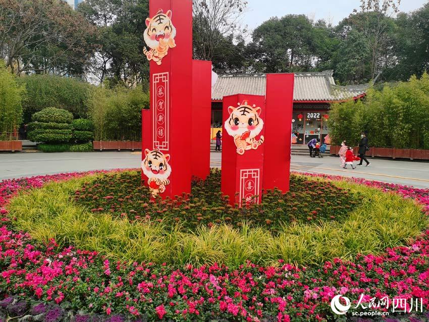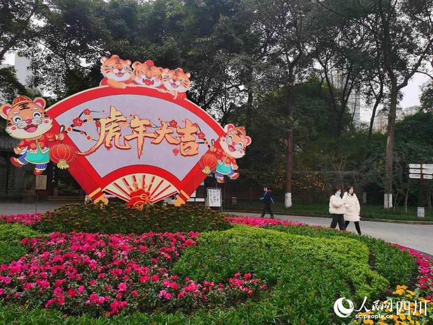 園內(nèi)的幾處空地上,布置了幾個(gè)花壇。上邊除了吉祥的紅黃色彩,還有可愛的動(dòng)漫形象老虎圖案?!盎⒛昙椤薄敖鸹⒂骸薄靶履昕鞓愤^年好”……各種好彩頭的詞語,標(biāo)示出歡度春節(jié)的主題,看了讓人精神為之一振。