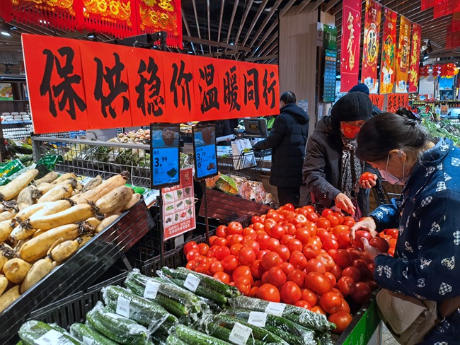 在超市發(fā)雙榆樹店,蔬菜售賣臺上“保供穩(wěn)價 溫暖同行”的標(biāo)語十分顯眼。據(jù)了解,春節(jié)前夕,為穩(wěn)定北京市場,讓市民在春節(jié)期間買到安全便宜的商品,北京市向各大連鎖超市發(fā)出倡議,堅(jiān)持10種蔬菜價格“兩不漲”,即日環(huán)比不漲價、農(nóng)歷同比不漲價(價格不高于農(nóng)歷同期)。