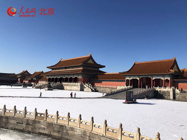 白雪映紅墻,紫禁城盡顯魅力。人民網(wǎng)記者 鮑聰穎攝