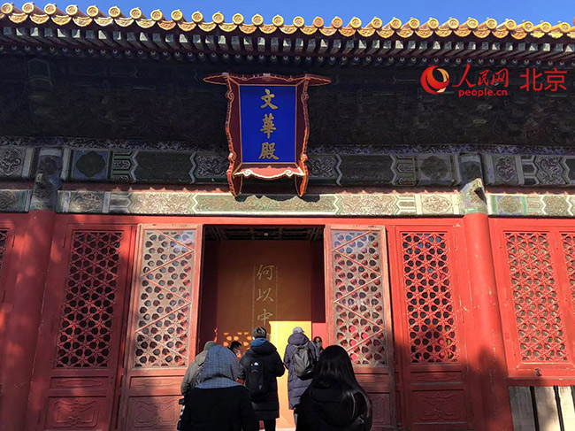 文華殿北側(cè)的文淵閣,作為此次展覽最后一件“展品”,與文華殿展廳結(jié)尾處的《四庫全書》(影印本)遙相呼應(yīng)。人民網(wǎng)記者 鮑聰穎 攝