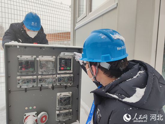 暴雪中,國網冀北電力場館電力保障隊員來到云頂滑雪公園巡視供電設備。 欒志成攝