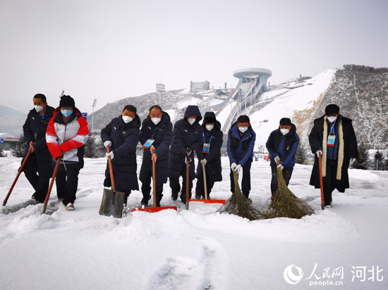 國家冬季兩項電力保障團隊在暴雪中清理積雪,確保設備健康。 馬錚攝