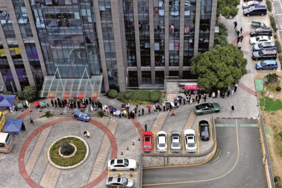 2月17日,在嘉興秀洲區(qū)新城街道中禾廣場,居民們排隊有序進行核酸檢測。