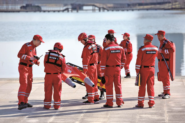 救援隊(duì)員湖畔練兵
