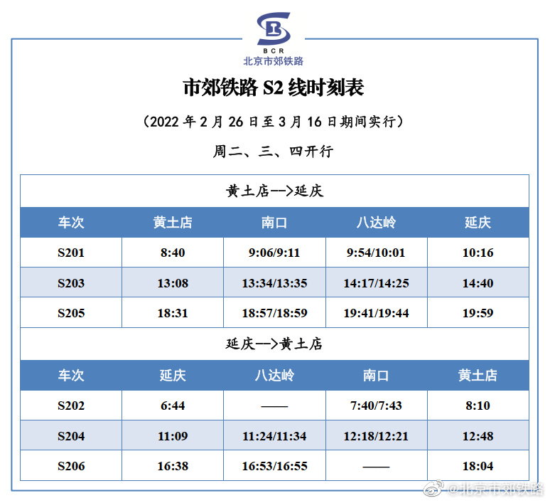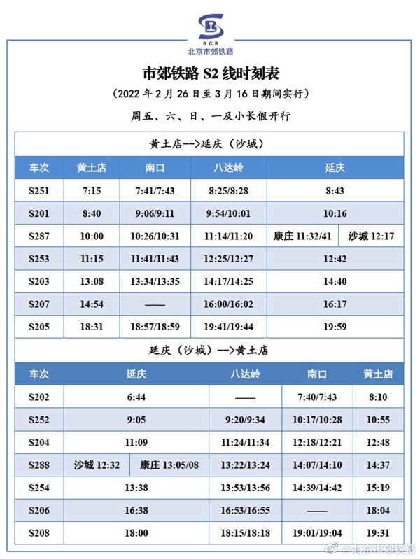 人民網(wǎng)北京2月25日電 據(jù)北京市郊鐵路官方微博消息,根據(jù)鐵路運(yùn)輸調(diào)整通知,2022年2月26日至3月16日, S2線恢復(fù)周二、三、四3對/日,周五、六、日、一及小長假7對/日的列車開行方案,列車開行時點(diǎn)無變化,具體列車時刻表如下所示。