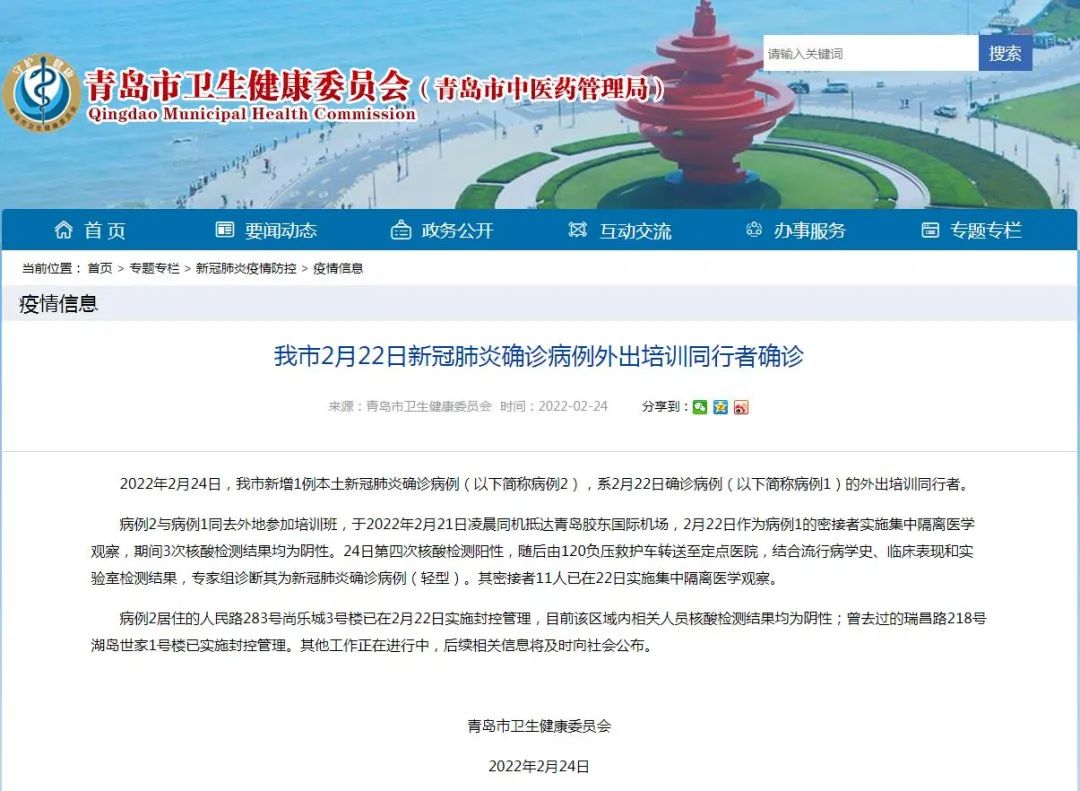 人民網(wǎng)青島2月24日電(鄭浦麗)據(jù)青島市衛(wèi)生健康委員會(huì)消息,2022年2月24日,青島市新增1例本土新冠肺炎確診病例(以下簡稱病例2),系2月22日確診病例(以下簡稱病例1)的外出培訓(xùn)同行者。