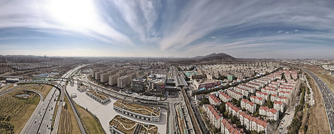 青龍地鐵小鎮(zhèn)地處滬寧高速、繞越高速、龍王山和規(guī)劃中的江南快速三環(huán)之間,秦淮東河的兩條分支九鄉(xiāng)河、七鄉(xiāng)河一東一西外圍環(huán)繞。片區(qū)北側(cè)的地鐵2號(hào)線南京大學(xué)仙林校區(qū)站、經(jīng)天路站,南側(cè)的4號(hào)線東流站、孟北站、西崗樺墅站,5座地鐵站呈環(huán)狀串起整個(gè)片區(qū)。沿著片區(qū)北部的龍王山大道前行,九鄉(xiāng)河支流穿“鎮(zhèn)”而過(guò)。河畔山體被修整為小公園,還配置親水平臺(tái)、健身步道等。