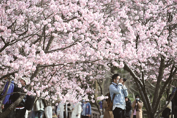 南京中山植物園北園的櫻花大道,一眼望去,好似被粉色云彩包裹住,如夢如畫。圖為7日,不少市民游客在櫻花樹下打卡拍照。