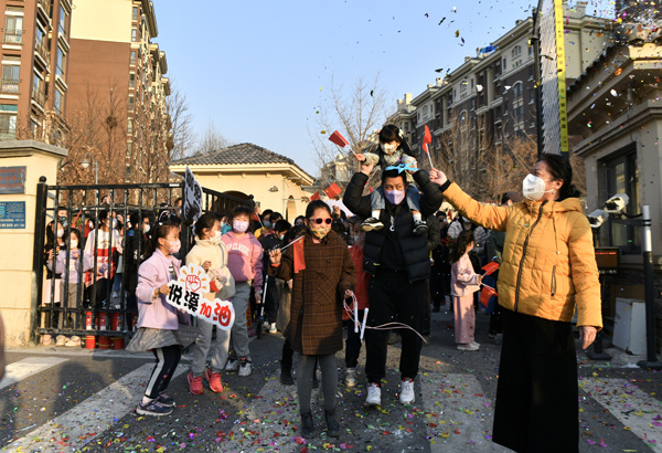 在潤澤悅溪小區(qū)門口,工作人員快速拆除快遞架,小區(qū)大門緩緩打開,居民們興高采烈地結(jié)伴走出小區(qū)。社區(qū)黨委書記、居委會主任分別向志愿者代表頒發(fā)證書并送上鮮花,向入駐社工、民警、機關工作人員獻上鮮花,為社區(qū)衛(wèi)生服務中心和來廣營派出所送錦旗,為愛心企業(yè)頒發(fā)獎牌。居民代表向社區(qū)黨委及小區(qū)物業(yè)送錦旗。3月8日也是國際婦女節(jié),地區(qū)特意制作了電子賀卡,為每位女性同胞送上節(jié)日祝福。