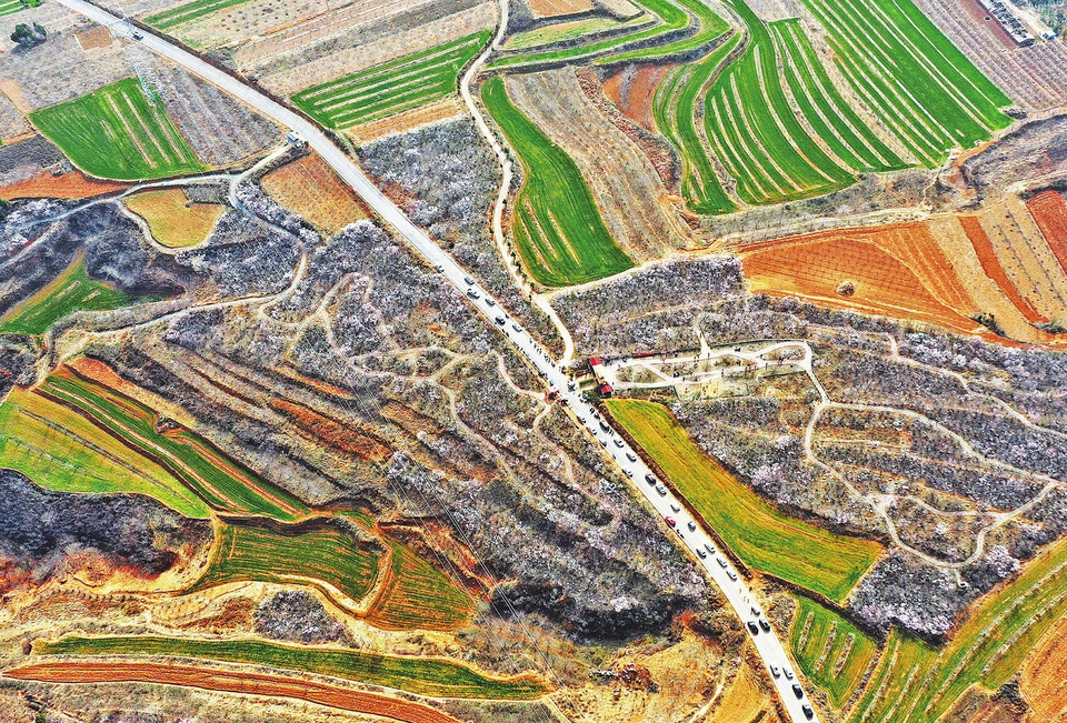 3月14日,無人機拍攝的畫面。連日來,垣曲縣嶺回村5000畝山桃花斗艷綻放,與綠油油的麥苗相映襯,構成一幅多彩的美麗圖畫。眾多市民在認真做好疫情防護的同時,三三兩兩走出戶外,親近大自然,感受大自然,領略美麗鄉(xiāng)村春日無限風光。(魯國林攝)