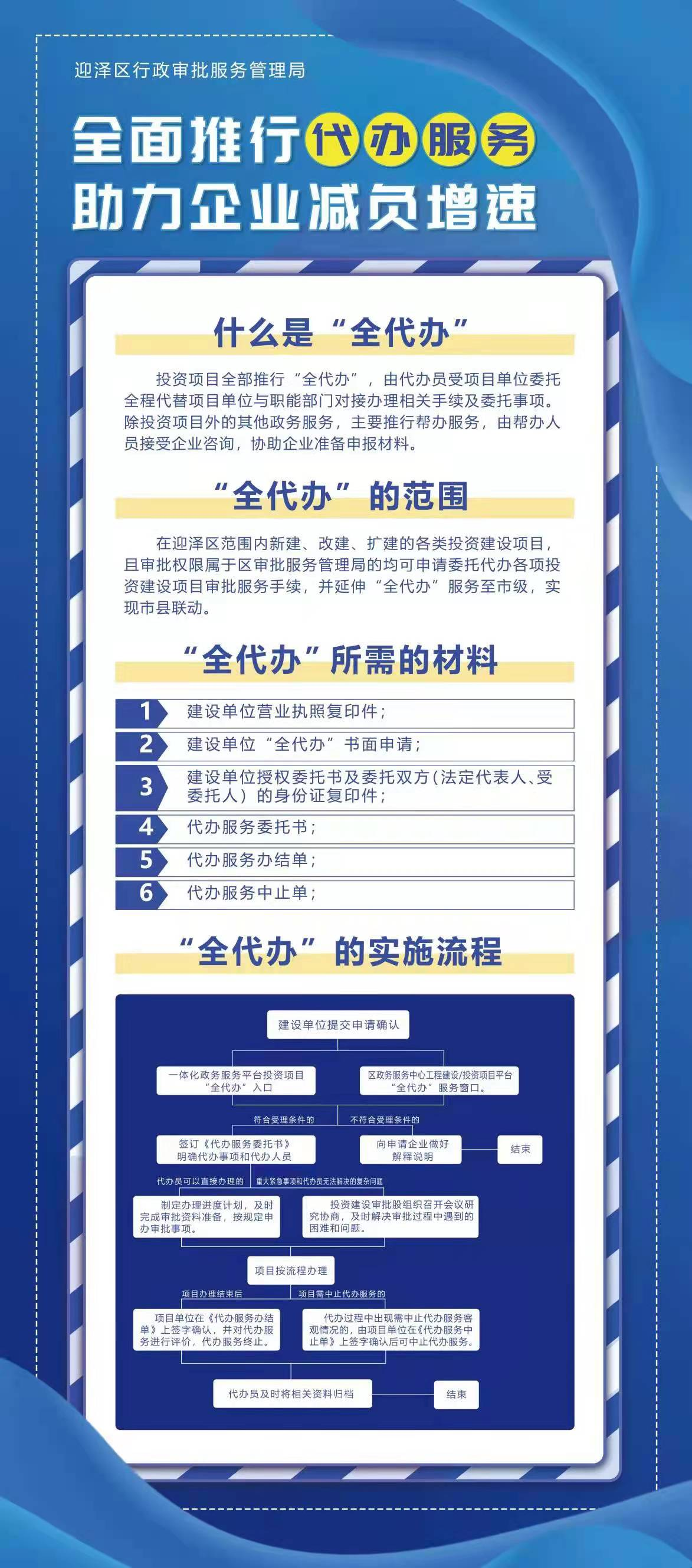據(jù)介紹,針對(duì)項(xiàng)目審批手續(xù)多、時(shí)限長(zhǎng)等問題,太原市迎澤區(qū)行政審批局梳理堵點(diǎn)痛點(diǎn),實(shí)施流程再造,開展了投資項(xiàng)目建設(shè)“全代辦”服務(wù),按照“合法高效、自愿委托、無償服務(wù)、全程跟蹤、協(xié)同聯(lián)動(dòng)”的原則,為企業(yè)提供委托項(xiàng)目一部門辦、一窗入件、一人代跑、一律免費(fèi)的“全代辦”服務(wù)。