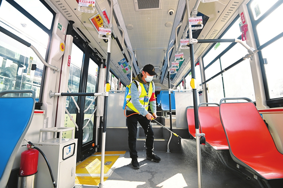 3月16日,太原公交三公司三車隊(duì)內(nèi),工作人員正在對公交車座位、拉手進(jìn)行消殺,嚴(yán)格執(zhí)行疫情防控措施,確保市民乘車安全。(記者阮洋攝)