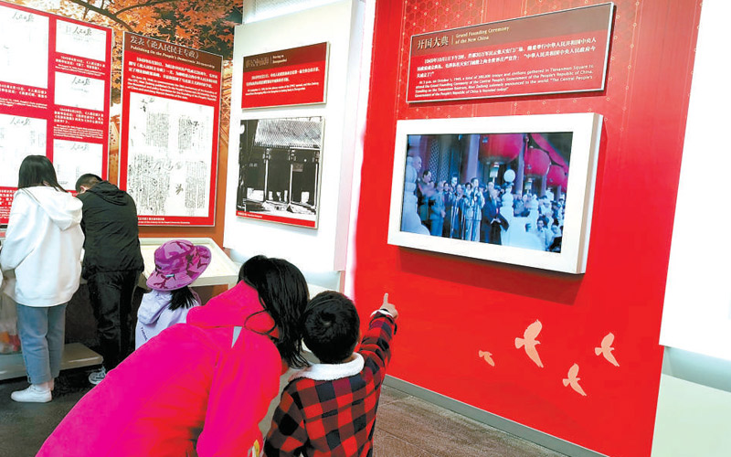 展覽當中的一段開國大典的影像資料讓游客們紛紛駐足?!爸腥A人民共和國中央人民政府今天成立了!”聽到錄音里毛主席的這段莊嚴宣告,游客們不由地挺直了腰桿。