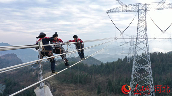 河北送變電公司高空作業(yè)人員認(rèn)真開(kāi)展架線施工。 王學(xué)恩攝