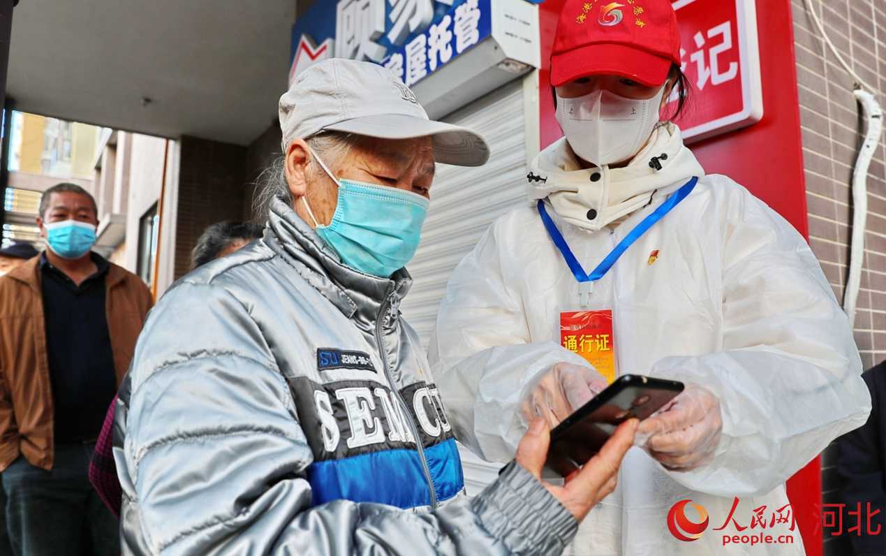 3月26日,在秦皇島市海港區(qū)白塔嶺街道森林逸城社區(qū)內(nèi),黨員志愿者指導(dǎo)居民使用電子健康卡。 曹建雄攝