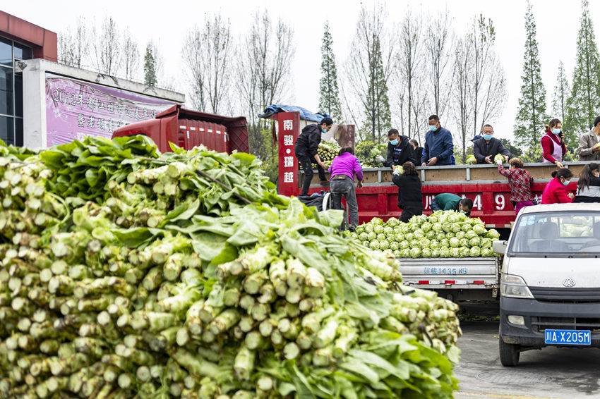 都江堰市民對(duì)蔬菜進(jìn)行分揀、裝車。何勃攝