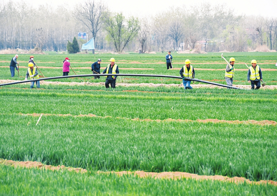 4月2日,在翼城縣南梁鎮(zhèn)梁壁村高標(biāo)準(zhǔn)建設(shè)農(nóng)業(yè)生產(chǎn)基地,技術(shù)人員在安裝節(jié)水管道。該基地著力在“高效節(jié)水”上蹚出一條新路徑,通過(guò)智能管灌、智能?chē)姽唷⒅悄艿喂嗳?xiàng)高效節(jié)水措施,為農(nóng)業(yè)灌溉充分利用地表水、合理使用淺層水、嚴(yán)控地下水提供先例打好基礎(chǔ),確保糧食豐產(chǎn)增收。(閆銳鵬攝)