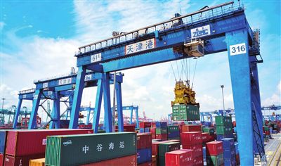 在天津港集裝箱碼頭,遠程自動化集裝箱軌道橋正進行裝卸作業(yè)。