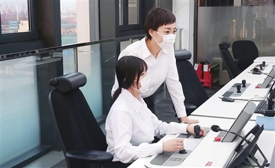在天津港集裝箱碼頭遠程操控中心,軌道橋女司機丁亞楠(后)正指導同事遠程操控。(天津港集團供圖)