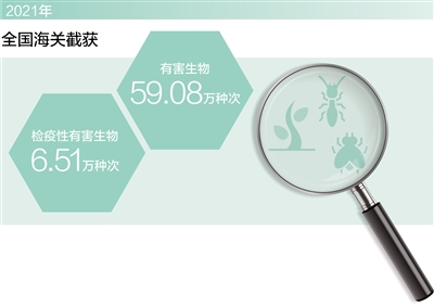 據(jù)統(tǒng)計,2021年,全國海關(guān)截獲有害生物59.08萬種次、檢疫性有害生物6.51萬種次,首次檢出致死粒線蟲、鈴蘭短體線蟲、北美齒小蠹等危險性有害生物,有效防止紅火蟻、高致病性禽流感等重大動植物疫情疫病傳入,退回、銷毀不合格農(nóng)產(chǎn)品584批。