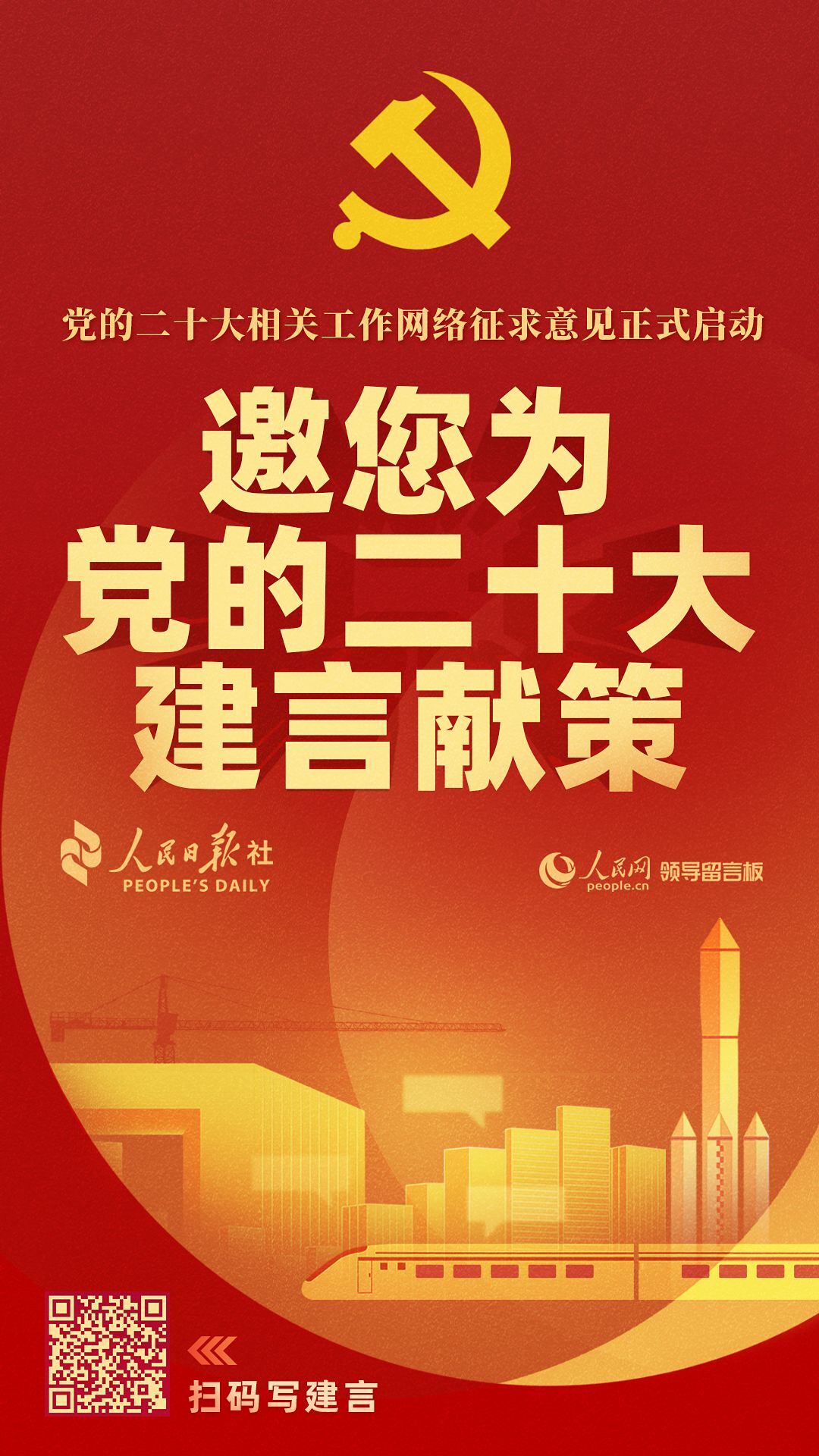 黨的十九屆六中全會(huì)決定,黨的二十大于2022年下半年在北京召開。開展黨的二十大相關(guān)工作網(wǎng)絡(luò)征求意見,充分彰顯了以習(xí)近平同志為核心的黨中央發(fā)揚(yáng)民主、集思廣益的優(yōu)良作風(fēng),是我們黨堅(jiān)持以人民為中心、尊重人民主體地位、走好群眾路線的重要體現(xiàn),是發(fā)揮中國(guó)特色社會(huì)主義制度優(yōu)勢(shì)、推進(jìn)全過程人民民主的生動(dòng)實(shí)踐,是適應(yīng)互聯(lián)網(wǎng)時(shí)代新要求、推進(jìn)國(guó)家治理體系和治理能力現(xiàn)代化的有益探索。