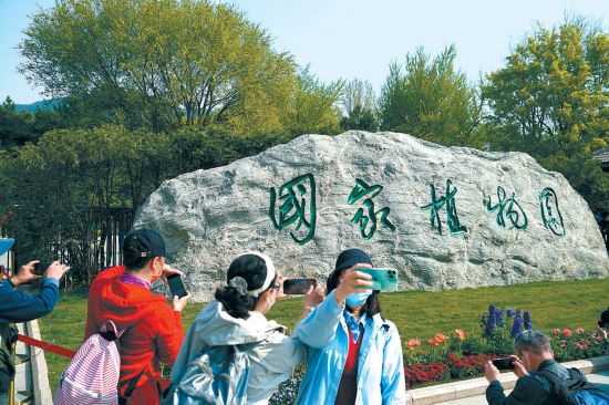 圖:昨天,國家植物園正式在北京揭牌,吸引眾多游客拍照留影。 本報(bào)記者 程功攝