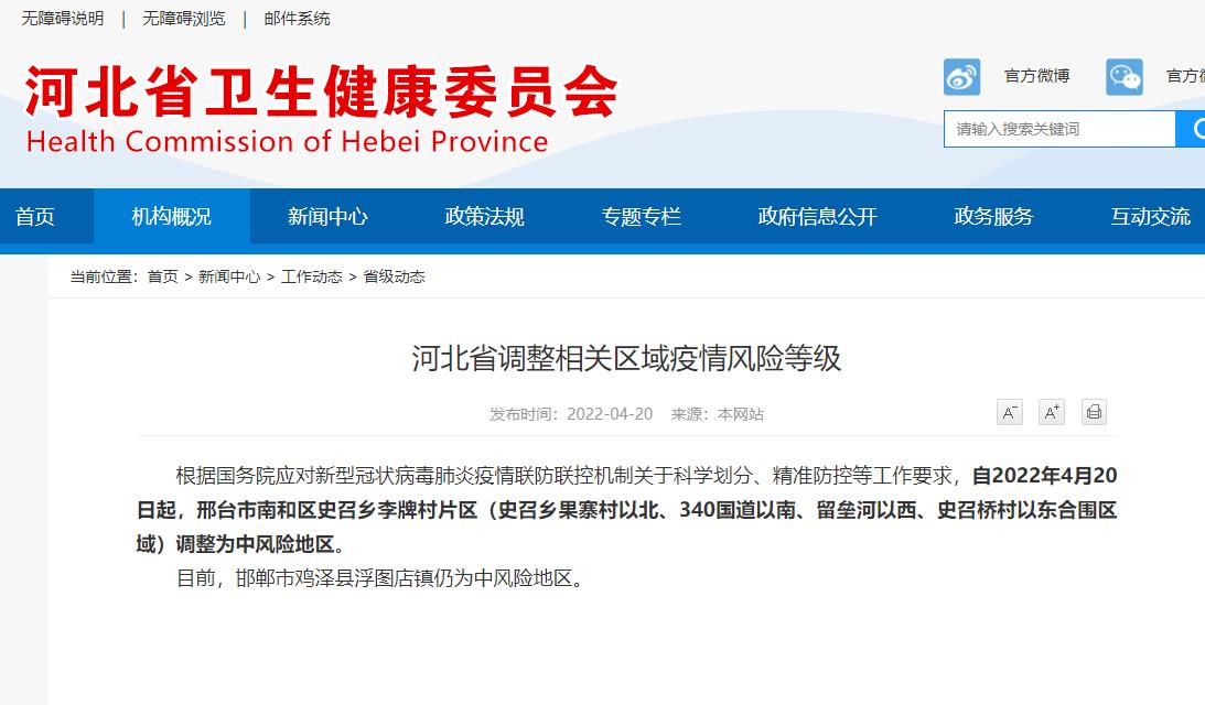 河北省調(diào)整相關(guān)區(qū)域疫情風險等級 邢臺市南和區(qū)史召鄉(xiāng)李牌村片區(qū)調(diào)整為中風險地區(qū)