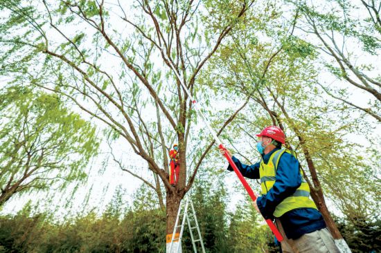 通州大運(yùn)河森林公園里,園林養(yǎng)護(hù)人員用高枝鋸修剪細(xì)枝。本報記者 潘之望攝
