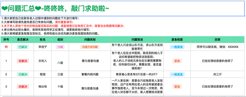 大學(xué)生志愿者團(tuán)隊(duì)負(fù)責(zé)人之一、2018級漢語言文學(xué)專業(yè)本科生李佳寧,設(shè)計(jì)了共享文檔,用于發(fā)布活動通知、匯總聯(lián)絡(luò)情況、提供答疑互助,為志愿者團(tuán)隊(duì)線上管理過程中的工作信息高效互通提供有利保障。符合青年學(xué)生信息溝通習(xí)慣的聯(lián)絡(luò)方式,得到了志愿者成員的一致認(rèn)同,陸續(xù)被充實(shí)的一條條聯(lián)絡(luò)記錄和心得體會,架起了老年人“數(shù)字鴻溝”的橋梁。