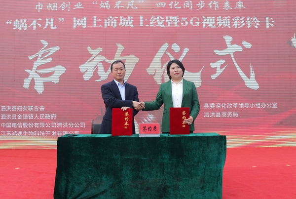 近日,江蘇省泗洪縣婦聯(lián)、改革辦、商務(wù)局、金鎖鎮(zhèn)人民政府和電信公司聯(lián)合舉辦“巾幗創(chuàng)業(yè)‘蝸不凡’,‘四化’同步作表率”現(xiàn)場活動(dòng),助力鄉(xiāng)村企業(yè)數(shù)字化復(fù)工復(fù)產(chǎn)?!拔伈环病本W(wǎng)上商城正式上線,5G視頻彩鈴卡同步啟動(dòng),電信公司和“蝸不凡”品牌企業(yè)簽訂了“云改數(shù)轉(zhuǎn)”合作協(xié)議。