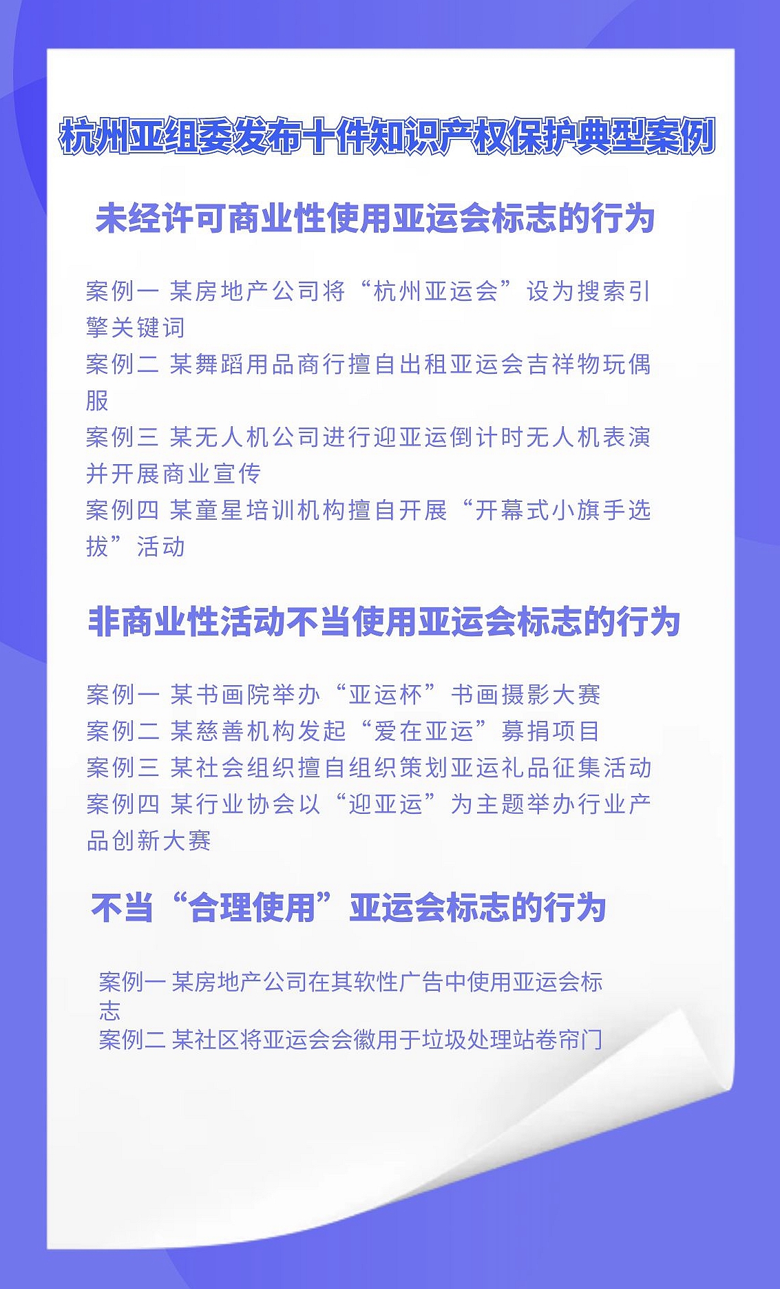 杭州亞組委發(fā)布十件知識產(chǎn)權(quán)保護典型案例。張麗瑋制圖