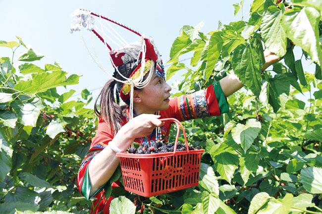 4月24日,金華市武義縣桃溪鎮(zhèn)錦平村內(nèi),身著畬族服飾的村民們正在采摘桑椹。通常,桑椹采摘到5月中旬結(jié)束,每年能帶動(dòng)村集體增收7萬(wàn)元左右。據(jù)了解,該村積極發(fā)展桑椹種業(yè),帶動(dòng)村民參與采摘,并對(duì)桑椹進(jìn)行桑椹酒、桑椹果干等產(chǎn)品開發(fā),增加附加值,讓村民增收致富。(章陳波、朱翚)