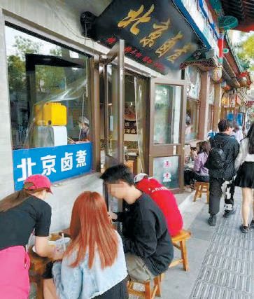 以什剎海游覽區(qū)東北角為例,沿街的小吃窗口相對(duì)密集,這些窗口附近正好是長長的臺(tái)階。從下午到傍晚,游客們像走進(jìn)了階梯教室一樣,人擠人、人挨人地坐到了臺(tái)階上,烤串、爆肚、熟食席地?cái)[放,用餐人員的密集程度比堂食還要高。