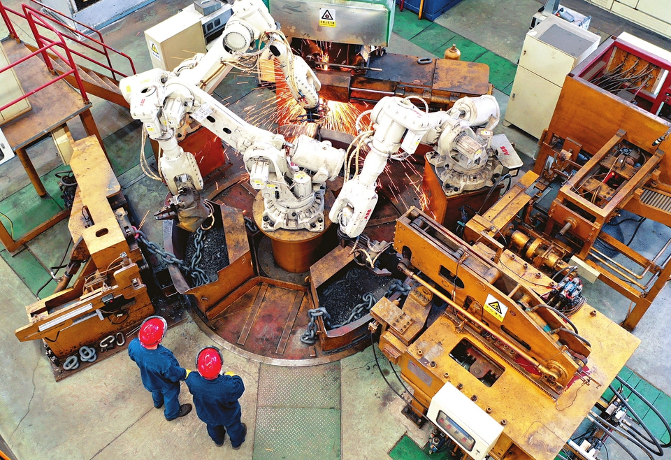 5月5日,在晉能控股裝備制造集團(tuán)華越華茂公司生產(chǎn)車間,國內(nèi)首套國產(chǎn)化礦用高強(qiáng)度圓環(huán)鏈全自動(dòng)制鏈機(jī)組正在作業(yè)中。近年來,該公司不斷提升裝備能力,其生產(chǎn)的礦用高強(qiáng)度圓環(huán)鏈、緊湊鏈及各類工業(yè)用鏈條,工藝達(dá)到國內(nèi)領(lǐng)先水平。(記者劉通攝)