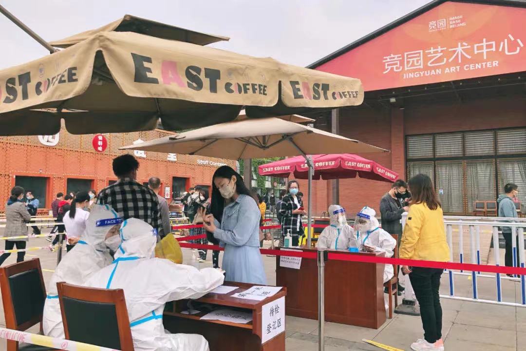 在通惠河畔文化創(chuàng)意產(chǎn)業(yè)園核酸檢測點,一枚枚紅色“黨員志愿服務(wù)”袖標格外醒目。